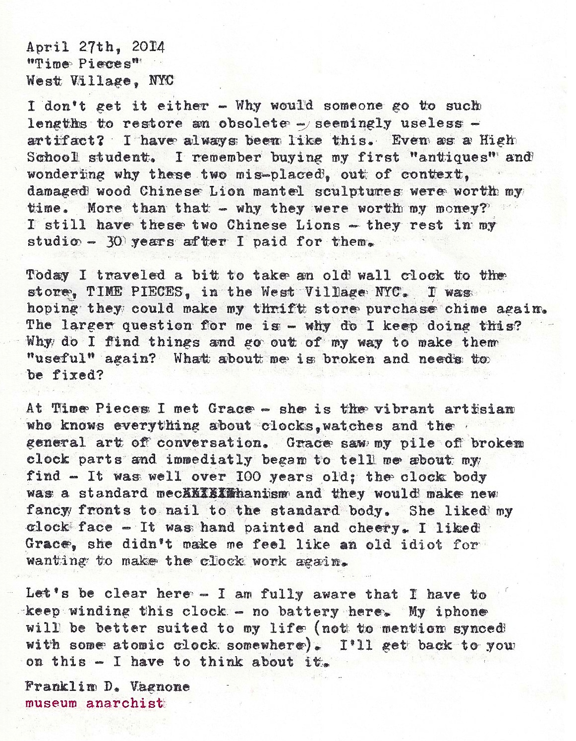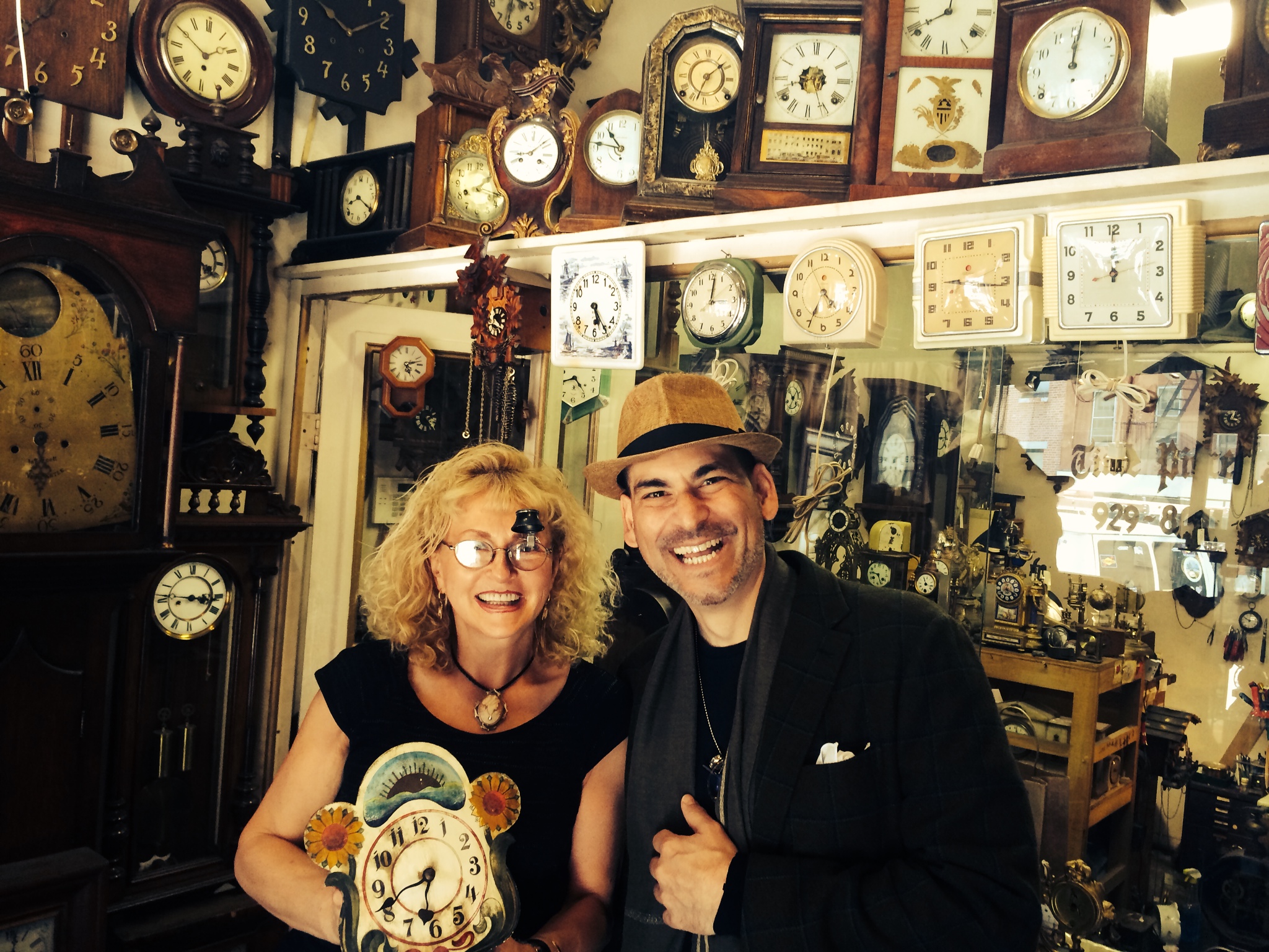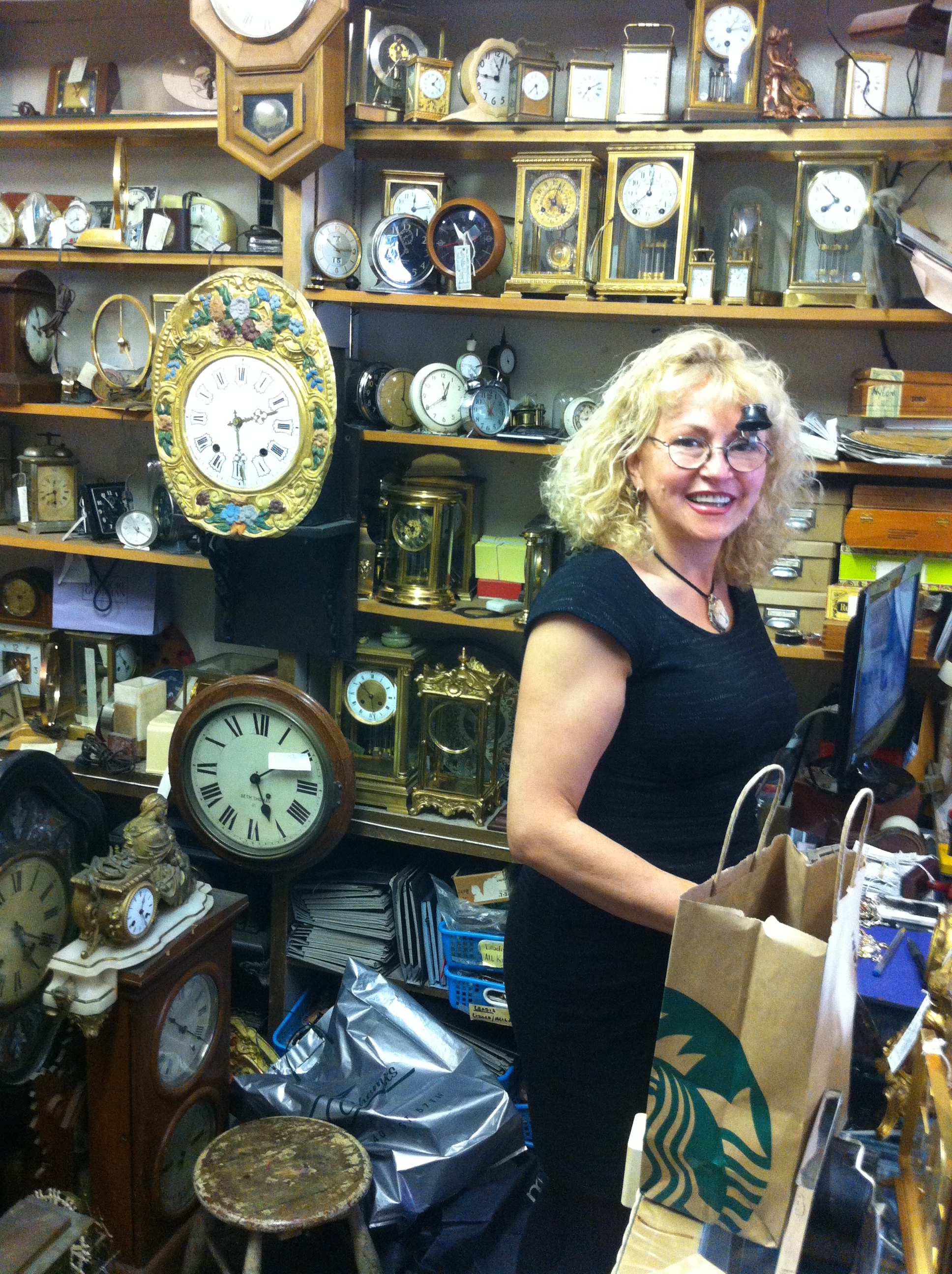 Here I am with Grace Szuwala, the owner of TIME PIECES. She understands my nutty behavior and is is going to help me by “fixing” my clock.