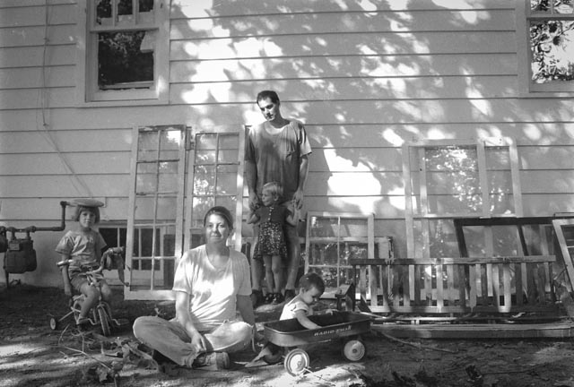 Family & WindowsFranklin Vagnone with Laura Orthwein,  Claire, Emma and Sophia – surrounded by a few of the extensive window sash collection. Photos by Daniel Eller. 2001.