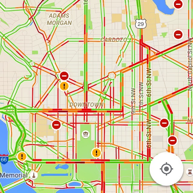 Once we entered the D.C metro area I logged onto my social media news outlets to see how the traffic situation was resolving itself. I checked out the Google traffic map and I was verified in my quick travel methodology switch. There was a lot of red on that map. I wouldn’t have made my required arrival time.