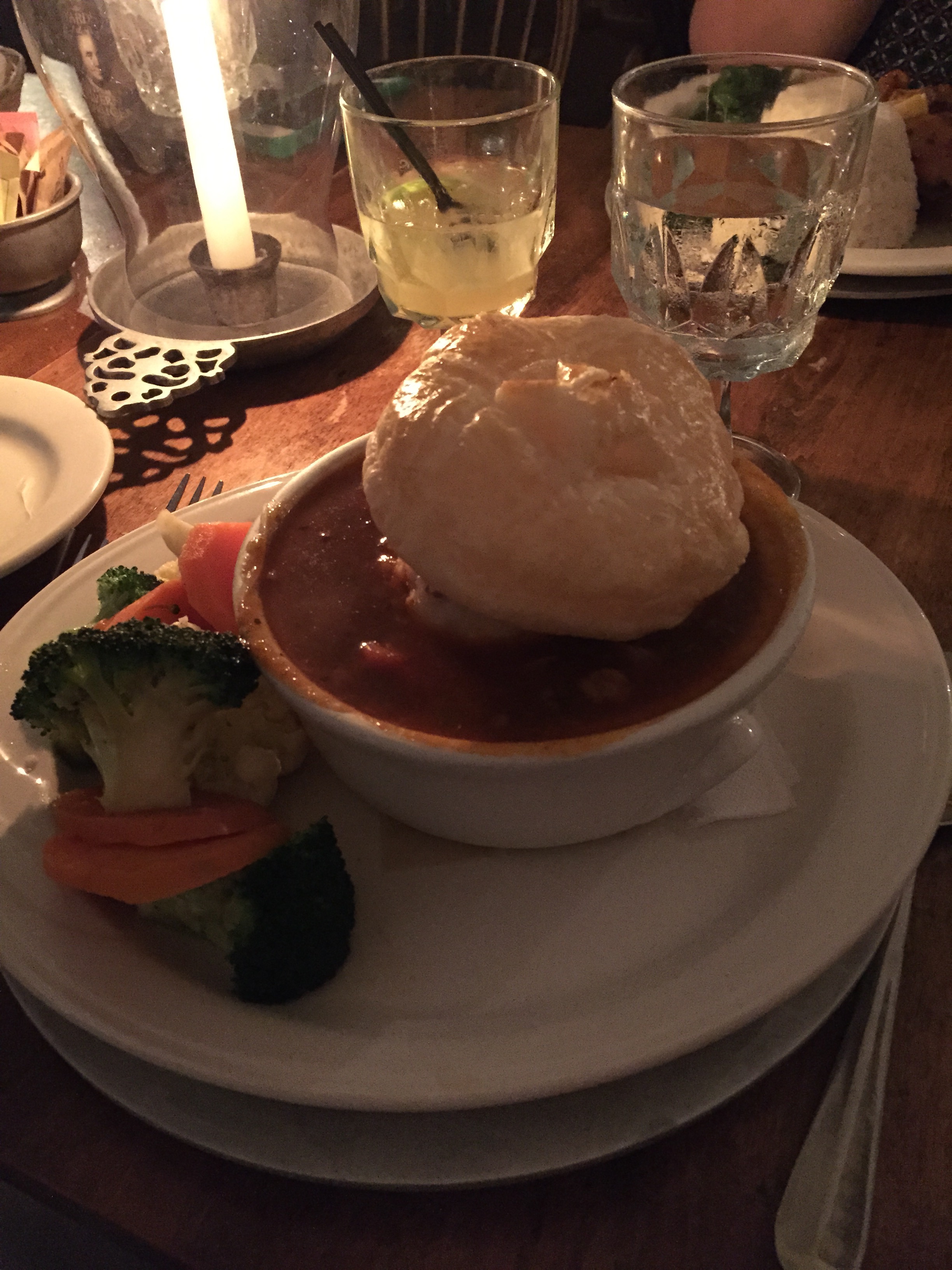 The afternoon progressed with my consulting and presentation efforts, and, following the evening public presentation, my “One Night Stand” at Gadsby’s Tavern began. My hosts were, from the start – fun and full of interesting facts and juicy gossip, and I was told that they had planned an entire evening of fun experiences. They also told me that they saw themselves as continuing in John Gadsby’s legacy– they were simply the keepers of the Tavern and Hotel. The first event of the evening was a dinner in the historically atmospheric, and beautifully appointed Tavern. The table was set with pewter plates, candles and linen appointments. Because it was often the drink of choice at the tavern, it was suggested that I order the rum punch to start off the evening– and I did. Ye Olde Menue read like a possible history text of conjectural, hypothetical yet marvelous food options. I chose the Gentleman’s PYE. It was a kind’a meat stew with this big puff pastry thingy on top of it. It looked fancy. I was hungry. I drank my rum punch, ate my PYE and we chatted. It was a really pleasant dinner.
