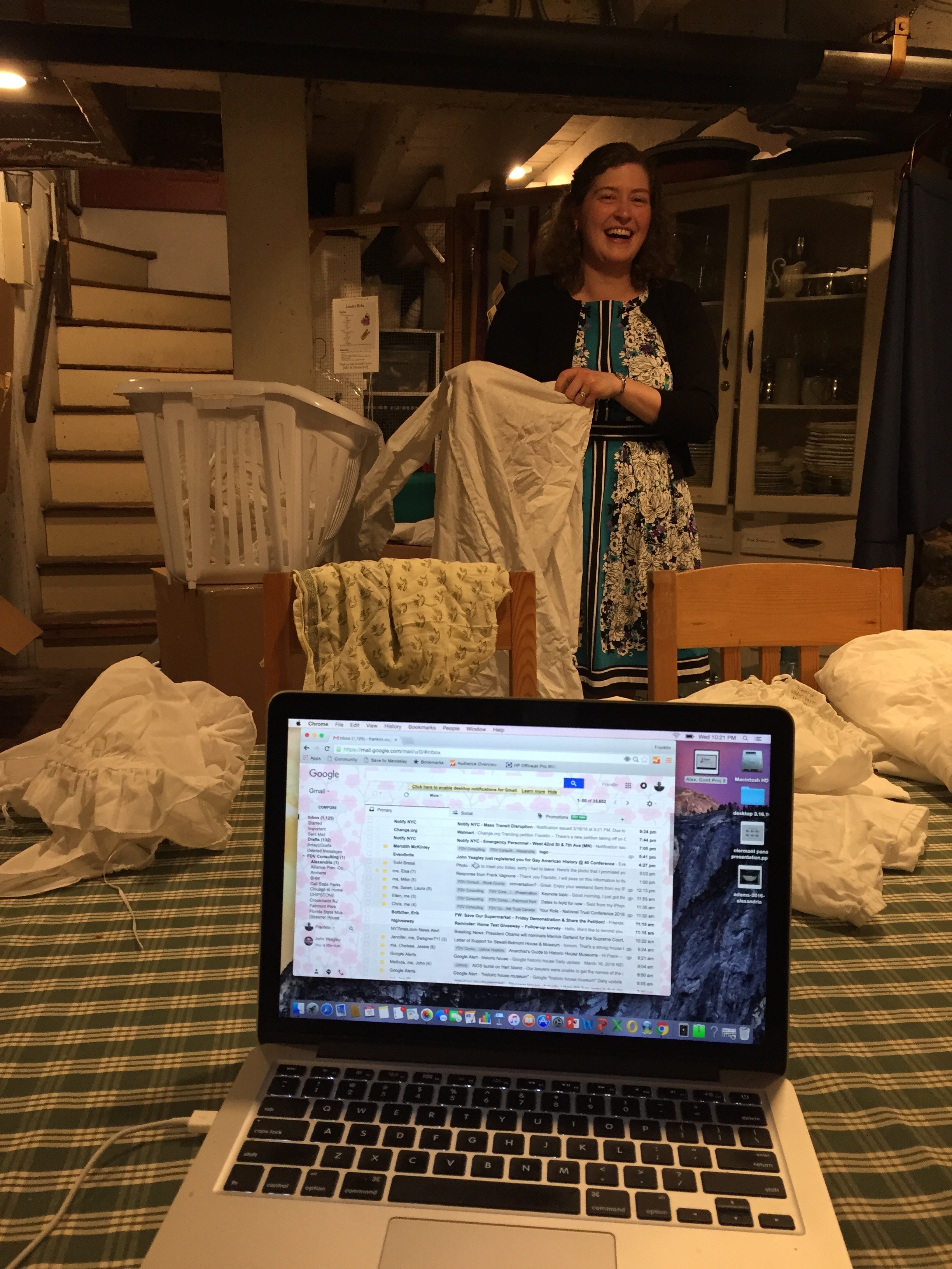 The table was not set up in any pretty way. In fact it still had crumbs on it from previous gatherings. There was nothing curated or special about any of this environment. We sat, eating our ginger bread and beer ice cream for well over an hour. We discussed Bernie; Hillary & Trump, slavery, the difference between a “dealer” and a “user”, COSTUMES vs. clothing, my travels around the country and what other historic sites were doing, allergies to wool dresses, our families; kids; and pets. Without trying, we all just fell into a natural, intimate experience that I seriously suspect is quite indicative of how it must have been historically for a New York City Traveler arriving to Alexandria in the 17-somethings. As a traveler, not only were you hungry and tired, but you were also in need of conversation. You wanted to share news, hear about their town, discuss what was going on in the colonies or the new nation, and just plain gossip. I imagine these discussions were current, relevant and immediate. I suspect that they were full of anxiety, companionship, intimacy, and, of course, leftovers from the previous day’s meals. The authentic Gadsby’s Tavern was to be found in the basement, not in their period rooms upstairs.
