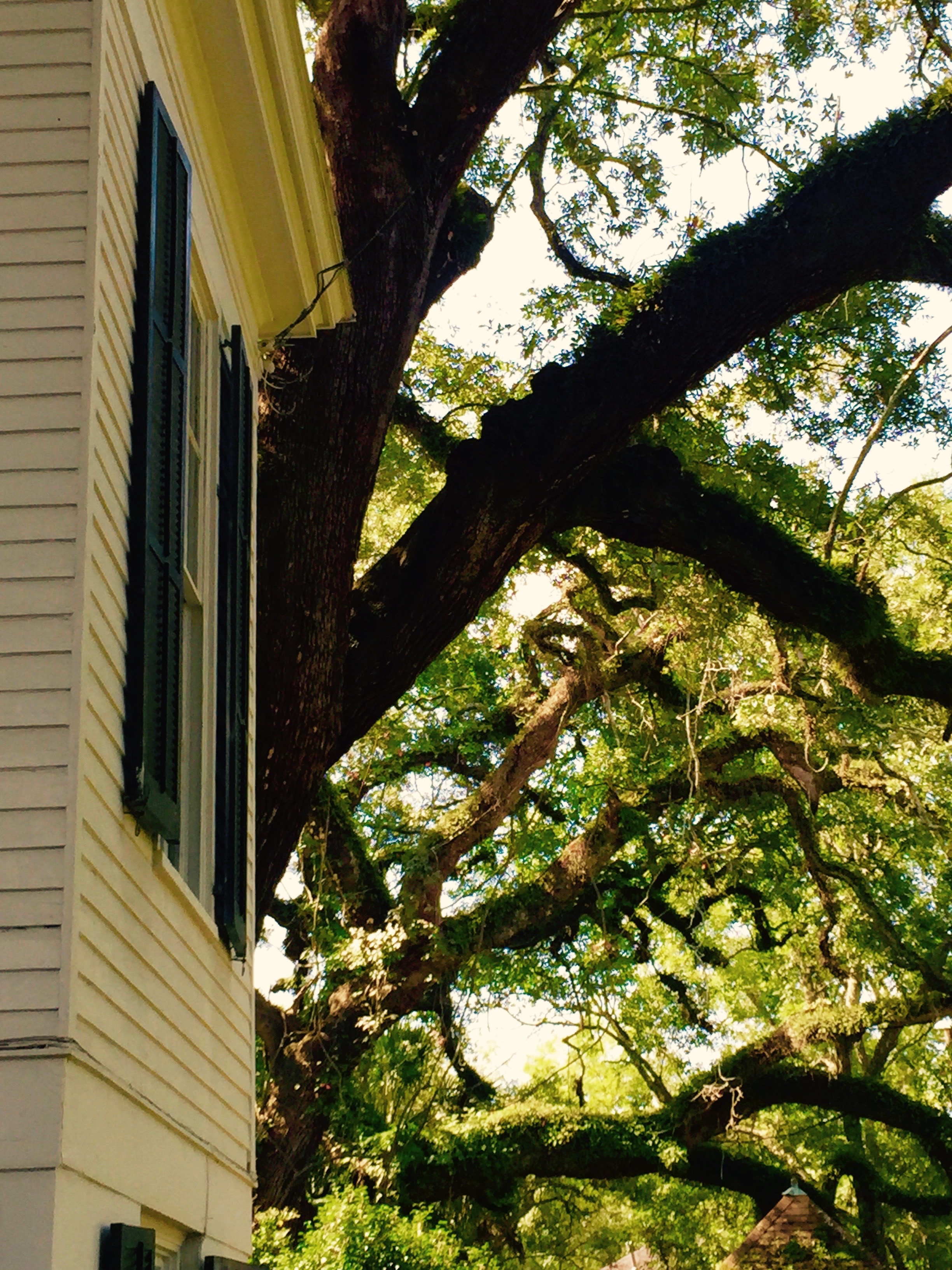 Oakleigh as a house and site is quite beautiful.  When I first approached, I was taken by the beautiful live oak grove that grows like moss around the crisp, clean white house.  There is something about the deep green oaks forming a frame into which the house is displayed that heightens the “object-ness” of this historic site.  So full is the oak tree canopy that the sun actually takes on a greenish hue.  It is hard to take an ugly photograph of this house.