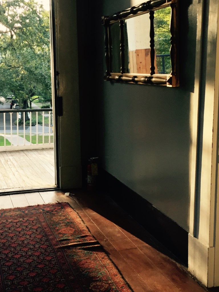 AT FIRST, the darkness of the rooms made it difficult to see and comprehend the furniture shapes.  Occasionally, a reflective surface would shine brighter than others and become the dominant object or surface in the room.  There was also a moment when, while working from my vantage point, the vibrant green of the exterior landscape went from visually dominant to DOMINANCE shifting to the room and activity within the room.  This occurred once enough sunlight had illuminated the room so that it took on an identity of its own. It occurred to me that my visual perception of Oakleigh changed according to both the level and direction of sunlight.   When dimly illuminated, the house felt thin and fragile.  Once it became more fully illuminated, I was able to better see all of the nuanced particles of its collective situation.