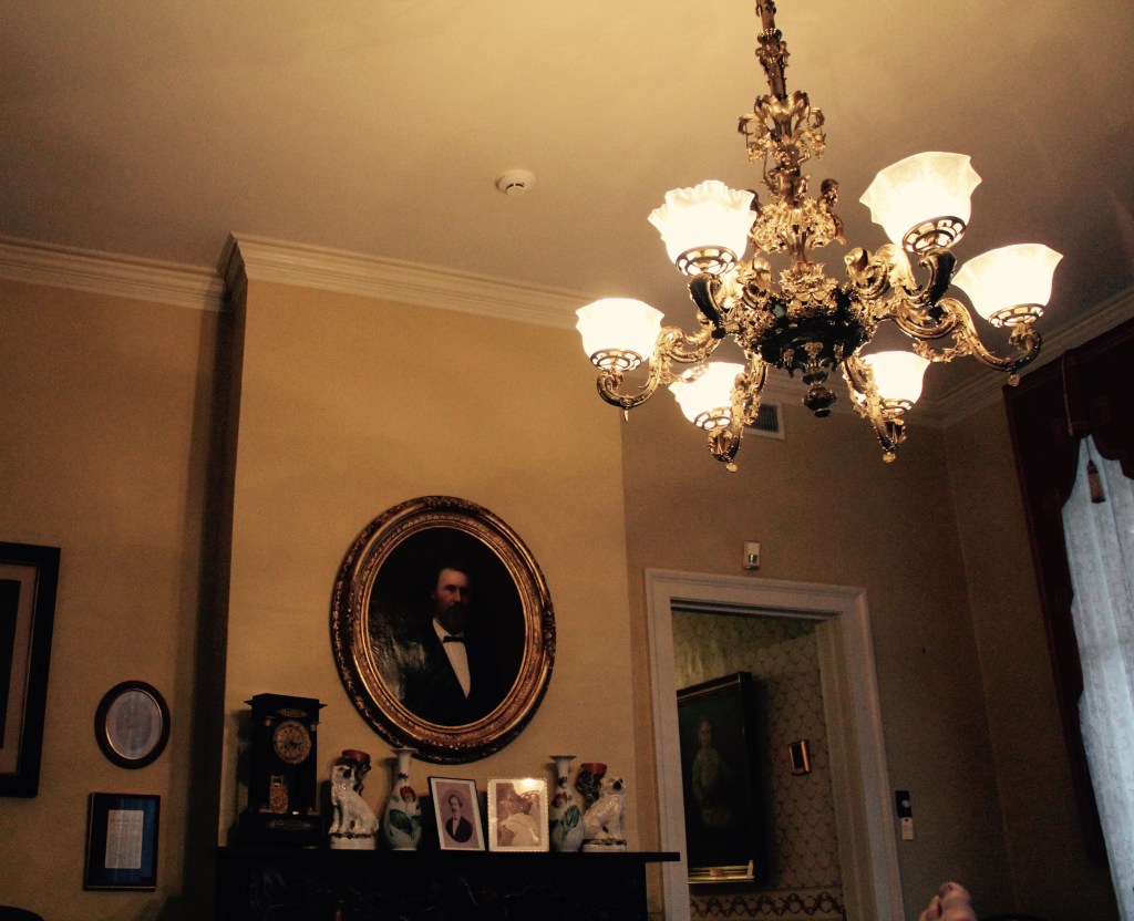 I walked around the house noticing the changes in the atmosphere from earlier in the day to the evening.  I found myself retreat into the one room that felt alive and welcoming, the room that is now interpreted as the library.  I had set up my computer and books on the library table.  The table was placed directly in the center of the room with the chair situated such that my back was to the door.  As the darkness increased, I have to say that it freaked me out a bit.  I rotated the chair and all of my stuff 180 degrees so that I faced the door.