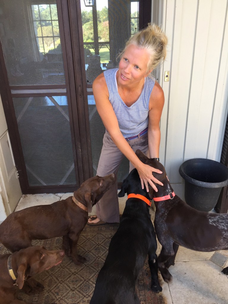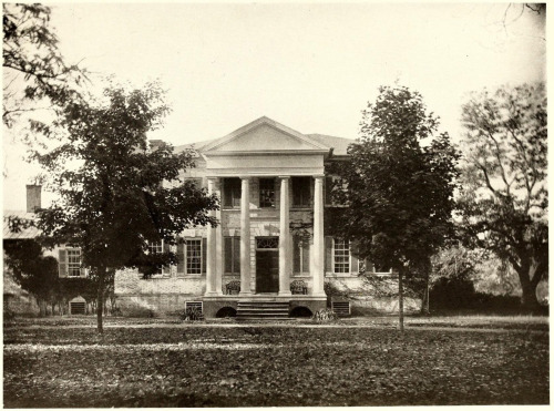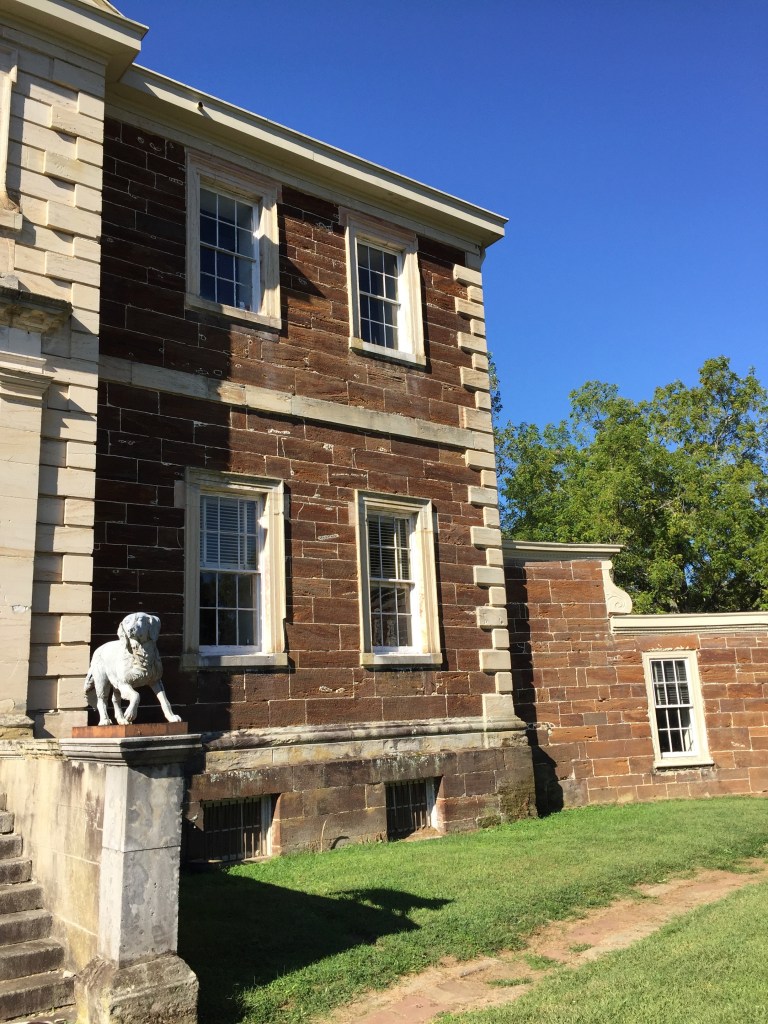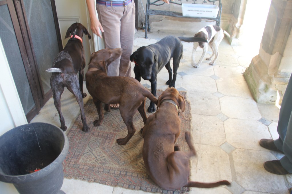 Next up on my quest was the privately-owned Mt. Airy Plantation. We were told that a conjectural slave dwelling was found in an outlying part of the estate, and we could be taken there if we would like to see it. As we drove up the gravel driveway we were stormed by barking dogs. Once we got out of the cars, we were warmly greeted by Catherine and J. Tayloe Emery, a descendant of the Tayloe family, present owners of Mt. Airy. Also living on the estate is their very knowledgeable uncle, Gwynne Tayloe. We met Catherine up on the pediment portico and she introduced us to all her dogs.