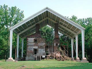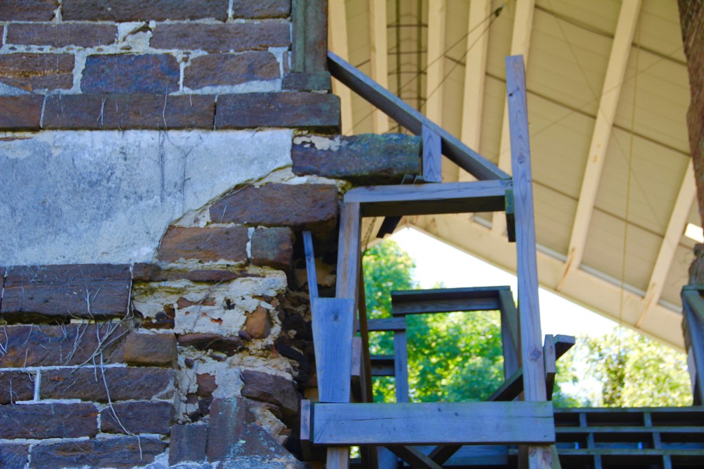 Unique among heritage sites, Menokin not only has some portion of an artifact-driven narrative, it has also dissolved in such a way as to reveal a narrative that in most cases is hidden and encased, away from public eyes. As I looked around at the Menokin ruin, I was struck by the intense attempts to stabilize the structure so as to not interfere with a view of the building, but also to ensure that no further natural deconstruction would occur. These modern insertions seemed to me to be written in a parasitic language that only made sense in context. Could these haphazard structural insertions be a manifestation of how we as historians make sense of the remains, physical, written, and oral, of past lives and narratives? The frustration for me is when these parasitic applications onto the existing fragment come to be seen as original and full of truth.