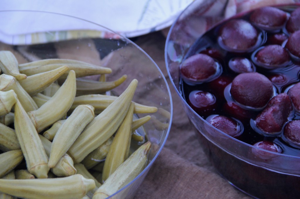 Our dinner was prepared by public historian, interpreter, and food historian Dontavius Williams. The meal consisted of traditional recipes that might have been cooked by the enslaved on the site. The open fire pit cooking area was surrounded by numerous tables decorated with flowers and plants gathered from the site itself. The meal and conversation were thoughtfully arranged and welcoming.