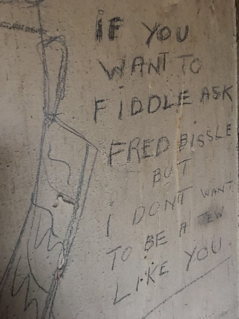 Once up in the attic, I could see that the ample space was partitioned off into smaller maze-like rooms.  I was told that I could sleep anywhere I like, but wherever it was would have to be on the hard-wood plank floors.  After walking about a bit, I threw my bags down into a north-facing room and set up my sleeping area.  Throughout the attic were disparate groups of images and graffiti, handwritten on the walls.  I was told that the messages date from WW II when soldiers were using the palace as part of the military effort.