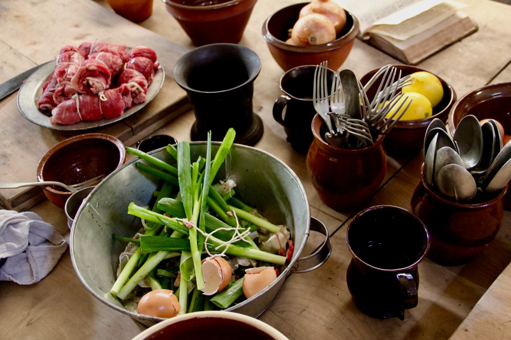Our cooks headed out to the kitchen garden to grab some fresh ingredients for the meal.  As I sat back and watched the team combine the ingredients, I was reminded how during this period they were not merely creating a great tasting food but combining elements in a way that could facilitate positive humors and internal “fluids.”  These things, of course, would ensure good health.  This viewing gave me a new understanding of a “medicinal and kitchen garden.”  Many of these plants served several purposes.