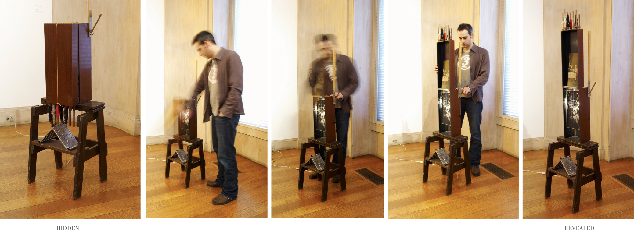 In my transient, kinetic monument projects, like the ones pictured here, I explore how revealing and concealing can become part of the memorial experience. The piece consists of a simple wooden cabinet mounted on a utilitarian stepladder – both found objects that carry their own histories of use and discard. Inside, fragments of domestic life are glimpsed through an intentionally restricted viewing experience, forcing the viewer to physically engage with the piece to access its contents. This interaction becomes a metaphor for how we engage with memory – partial, fragmentary, requiring effort and involvement. The motion of discovering what lies within mirrors our own process of uncovering historical truths, while the humble materials – the worn wood, the everyday objects, the makeshift display – resist the monumentality typically associated with memorial-making. Like the soil collections in Montgomery or Otero-Pailos’s preserved dust, these pieces elevate the overlooked and ordinary into memory carriers. But they go further by making remembering itself a physical, time-based experience. The viewer becomes a witness and participant, their movement and engagement essential to the piece’s meaning. This approach suggests that memory isn’t something to be passively received from an imposing monument but rather something we must actively work to uncover and understand.