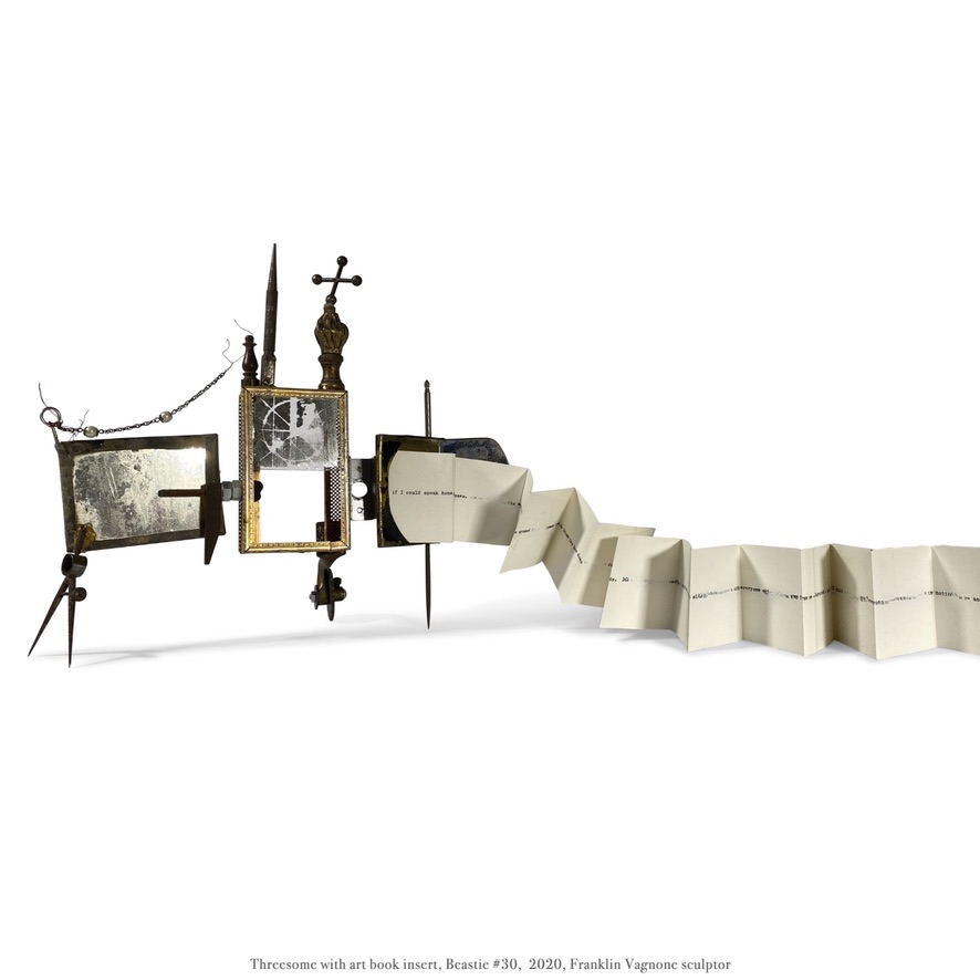 This understanding manifests directly in my sculptural work, particularly in “Threesome with art book insert, Beastie #30,” a portrait of my grandfather. The piece explores how personal identity exists within the larger public space framework – much like how we negotiate our place walking down these transitional urban pathways. The sculpture’s three interconnected frames create their own journey of revelation and concealment, echoing those magical moments when a narrow street unexpectedly reveals a grand plaza.