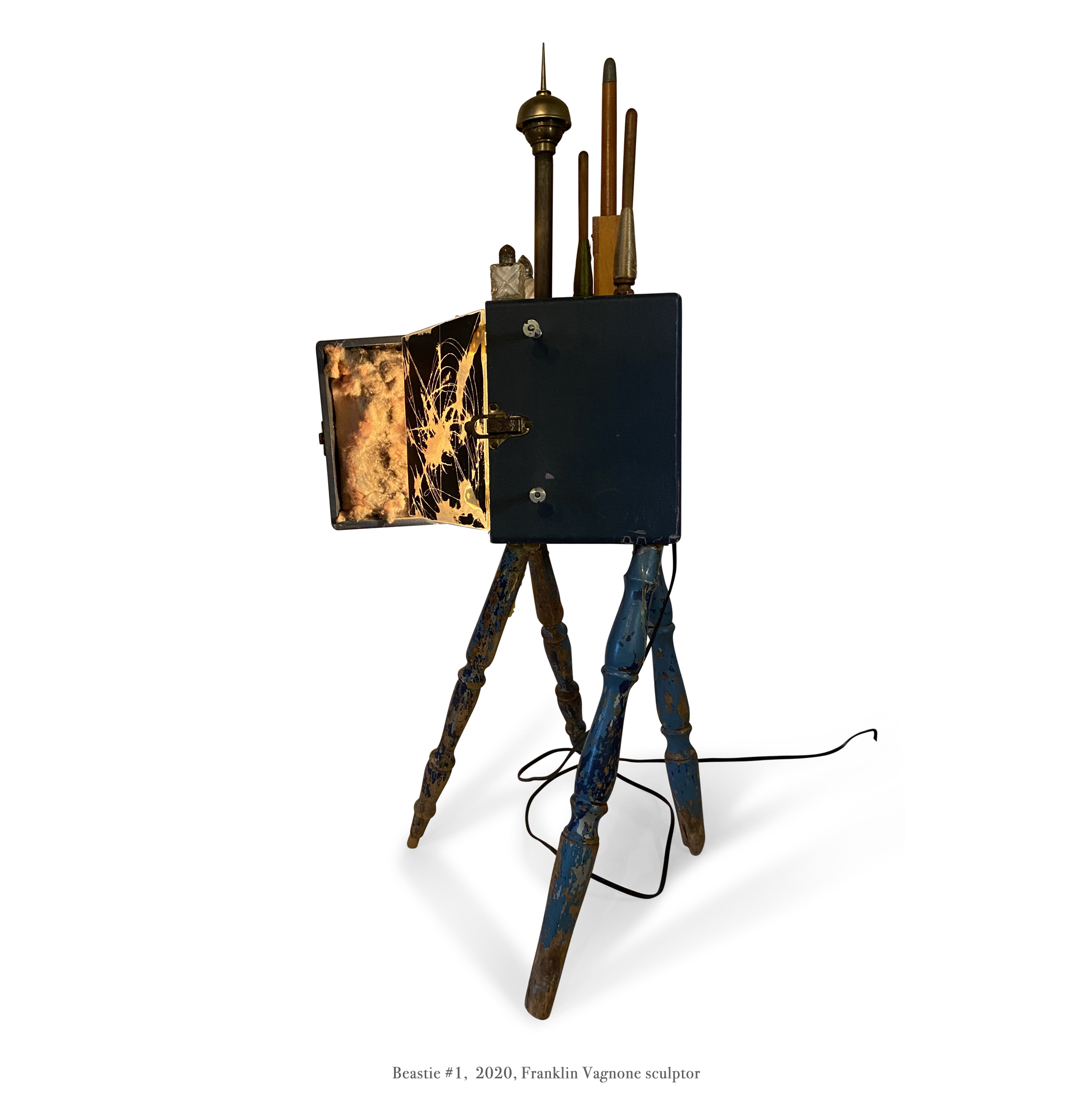 The piece balances precariously on its metal points, much like how we as individuals maintain our private equilibrium within the demanding theater of public life. Just as a city bench offers respite and a chance to shift from being viewed to becoming the viewer, the sculpture’s various angles and surfaces provide different ways of engaging with personal and public narrative. The ornate golden frame, distressed mirrors, and luminous blue glass segment create a kind of architectural psychology – each element representing different aspects of how we present ourselves in public while maintaining our private narratives.