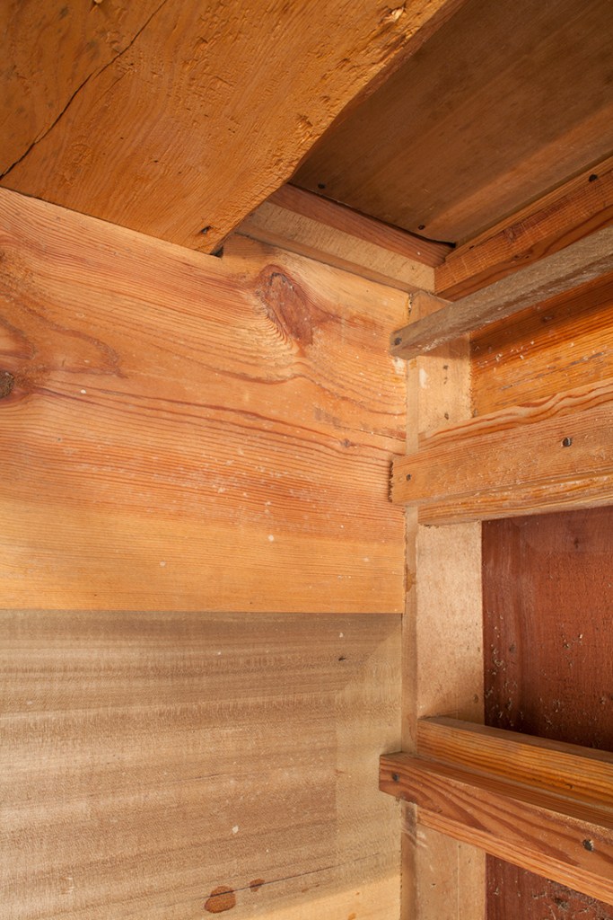 Once my items were secured, I walked backward down the stairs and began exploring. To my surprise, there was not simply one pre-manufactured iron house on the site, but three. Each was in varying degrees of restoration. The organization of these three houses produced a friendly landscaped, cloistered area. The main iron house, The Patterson House (c. 1850), the one in which I was spending my overnight, was original to the site. The second dwelling, The Abercrombie House, was moved in 1970, placed on the back edge of the property, and left as they found it. This unrestored iron house has the evocative quality of a stabilized ruin. The third iron house, The Bellhouse (c. 1853), serves as the education center. It had been stripped down to the fundamental structure to show how these pre-fabricated dwellings were made. Combined, all three of the structures tell a nicely tied narrative.