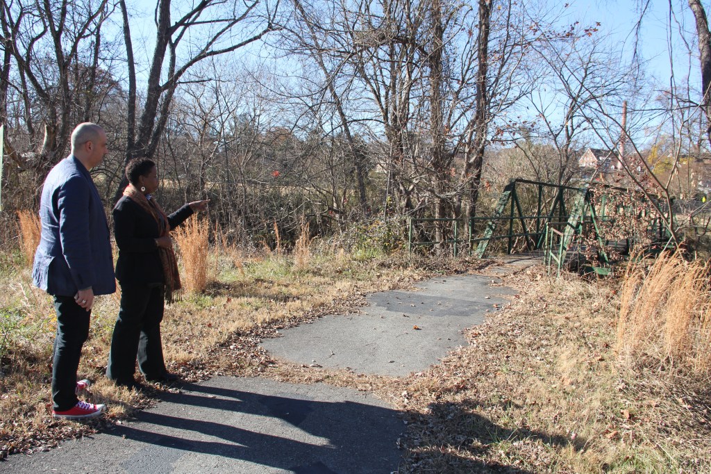 The main road, named “Liberia Street,” leads directly down to a footbridge that crosses a creek and leads to the town center of Salem. My host walked me across the footbridge and into Happy Hill. We walked up the main road and stood at the top of the hill. As you stand there, you are struck by how close it is to Salem; in fact, you can see Salem College and other Moravian Church buildings. Looking north and past Old Salem, modern skyscrapers of downtown Winston-Salem looms off in the distance to the east. There’s a clear divide between Happy Hill and the adjacent Old Salem, and it seems so close you could almost throw a rock into Salem Square.